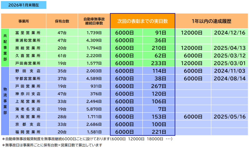 自動車無事故 安心への取組 HOME安心への取組自動車無事故 無事故カウンター(2026年1月末) 無事故達成ドライバー 無事故30年達成 房総営業所 E氏 戸田営業所 K氏 富里営業所 M氏 無事故6,000日達成事業所 戸田南営業所 2024年4月21日達成 海老名支店 配送課 2024年5月13日達成 久喜営業所 2025年3月12日達成 大阪営業所 2025年5月16日達成 無事故12,000日達成事業所 戸田南営業所 2025年3月1日達成